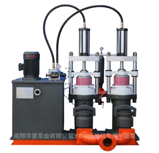 泵開始給壓濾機進料和低壓過濾時保持大流量不變,隨壓濾機空腔充滿物料壓力升高,壓濾機過濾能力開始變小,達到設定值時液壓系統控制YBH泵的運行速度降低、輸出流量變小。壓濾機過濾能逐漸降低,進料壓力逐漸升高,泵的進料流量自動變小,小流量為額定流量的20%,泵輸出流量壓力曲線與壓濾機佳過濾曲線基本吻合。全過程因此高效節能,比普通泵節能60%以上。